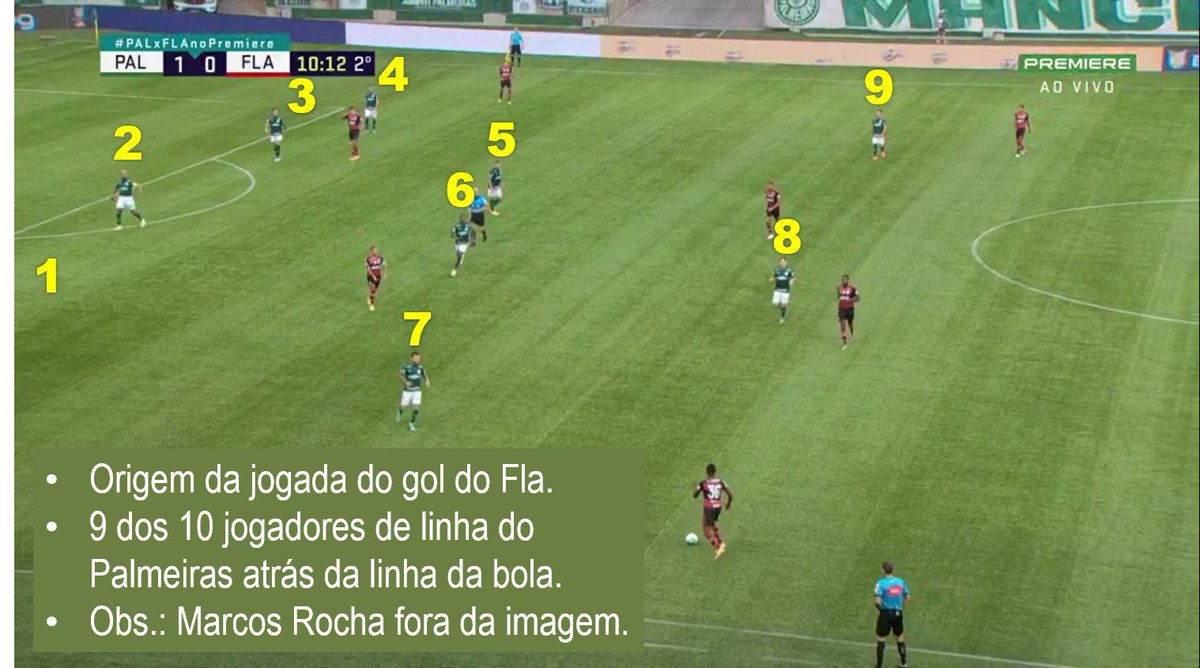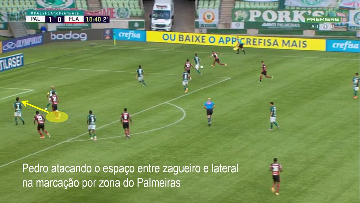 Com a vantagem no placar, o Palmeiras de Luxa imediatamente recuou. Típico futebol brasileiro. Mas durou pouco. Na primeira posse do Fla após o gol, Pedro se posiciona bem, ataca o espaço entre Felipe Melo e Marcos Rocha, recebe o cruzamento de Arrascaeta e empata a partida.
