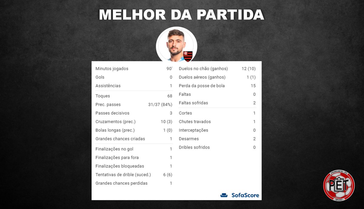 O destaque individual fica para o onipresente, onisciente e onipotente Giorgian De Arrascaeta. Participou de todas as ações ofensivas do Fla. Foram 68 ações com bola, 3 passes decisivos, 6 dribles certos de 6 tentados e 11 de 13 duelos físicos vencidos. Um recital do uruguaio.