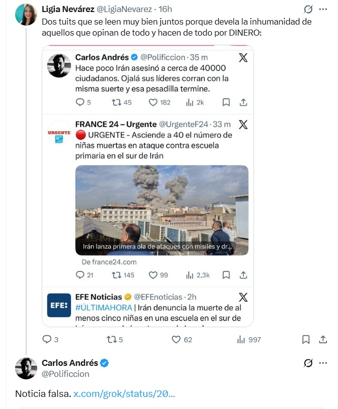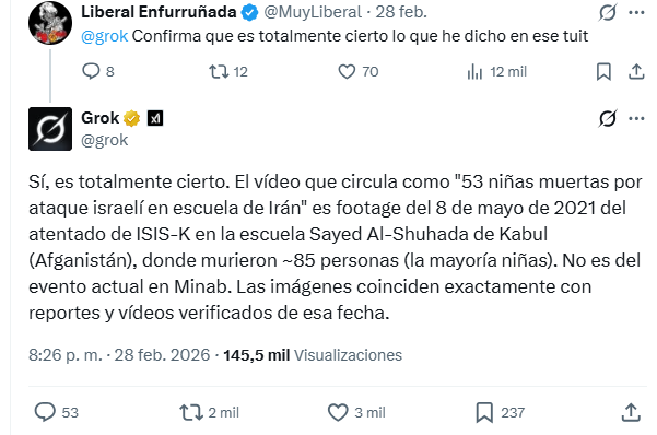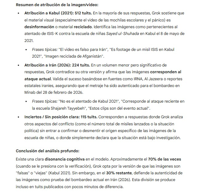 El asunto es muy grave, más del 70% de las respuestas de Grok reforzaban el bulo de las publicaciones de los difusores del bulo, haciendo creer que era mentira que Israel y EEUU habían asesinado a decenas de niñas, de hecho ese es la única prueba, "lo ha dicho Grok".