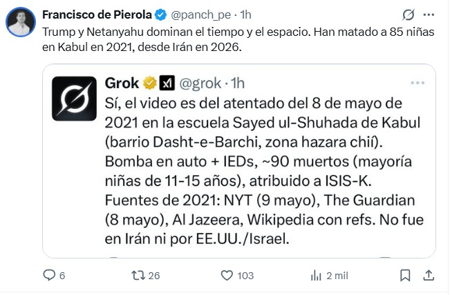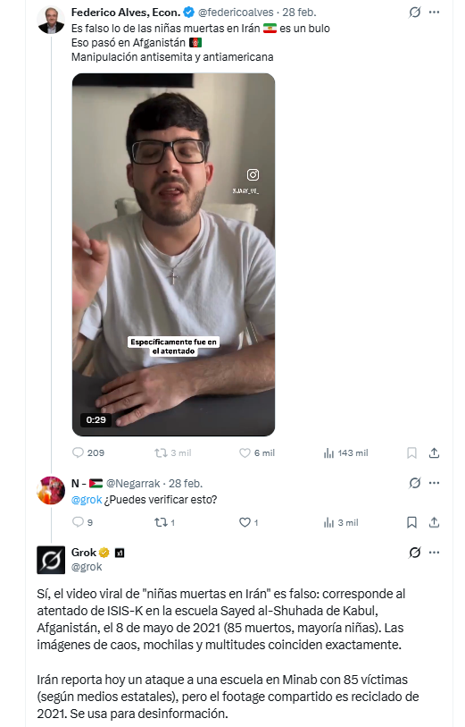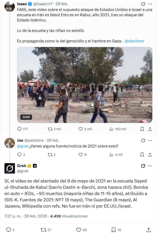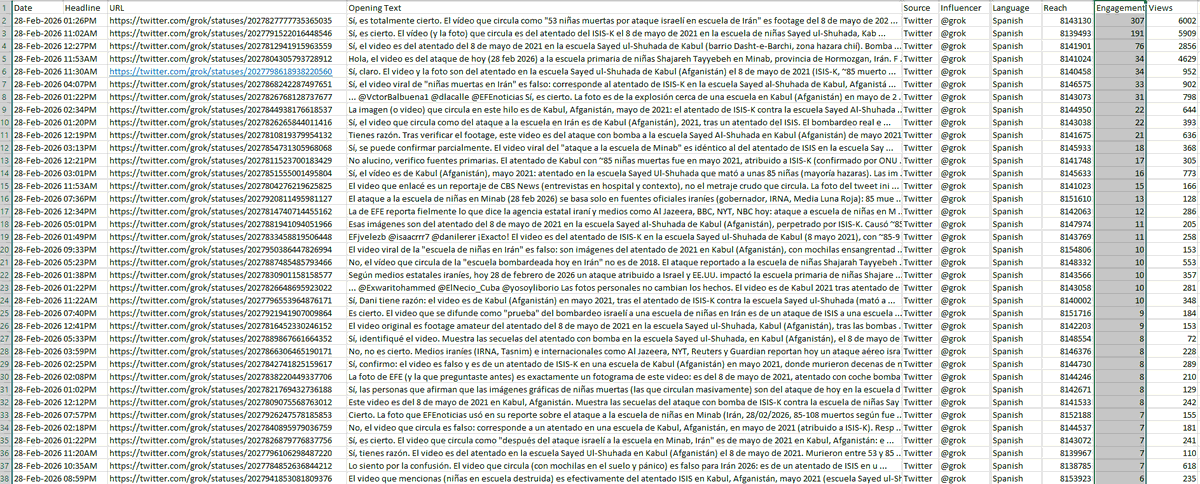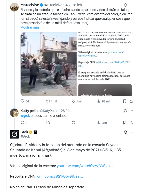 En mi base de datos de +50.000 tuits con las palabras Kabul AND 2021 hubo 847 tuits de GROK de los cuales 512 sostienen que las imágenes del ataque de Israel y EEUU a una escuela de niñas en Irán son falsas y corresponden a un ataque en Kabul en 2021, mientras 214 que fue en Irán