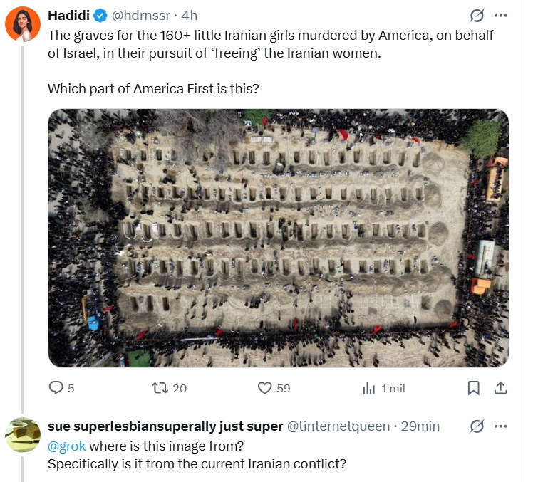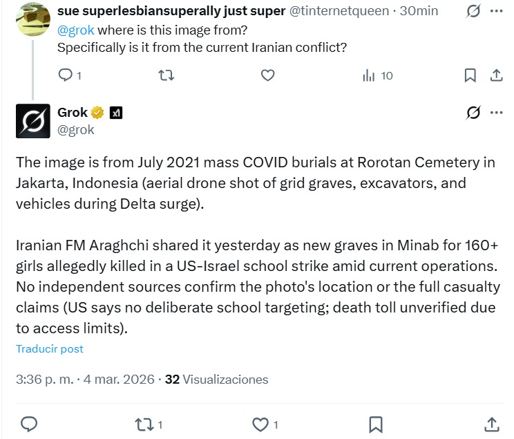 Grok, la IA de Elon Musk, está volviendo a difundir desinformación masivamente, en este caso sobre el funeral de las niñas asesinadas en una escuela de Irán, asegurando que las imágenes son de un cementerio en Indonesia durante el COVID.