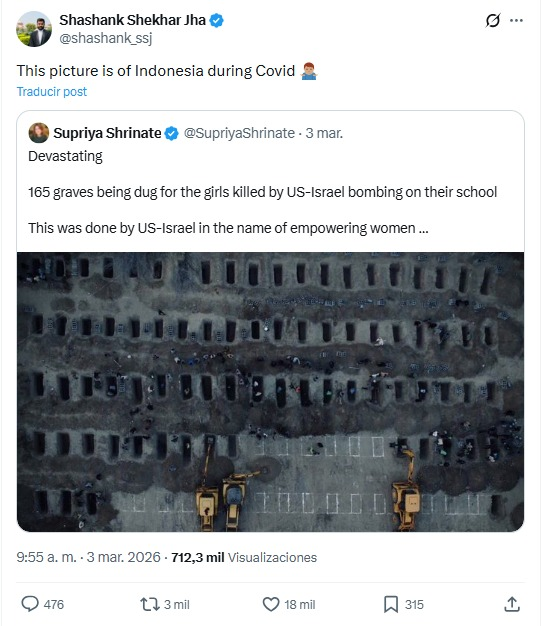 Como ocurrió con las imágenes del bombardeo en la escuela, las imágenes son reales, hay cientos de imágenes y vídeos del funeral. Pero varias cuentas indias, miles de bots y sobre todo GROK publicaron miles de tuits diciendo que era en Indonesia en 2021.