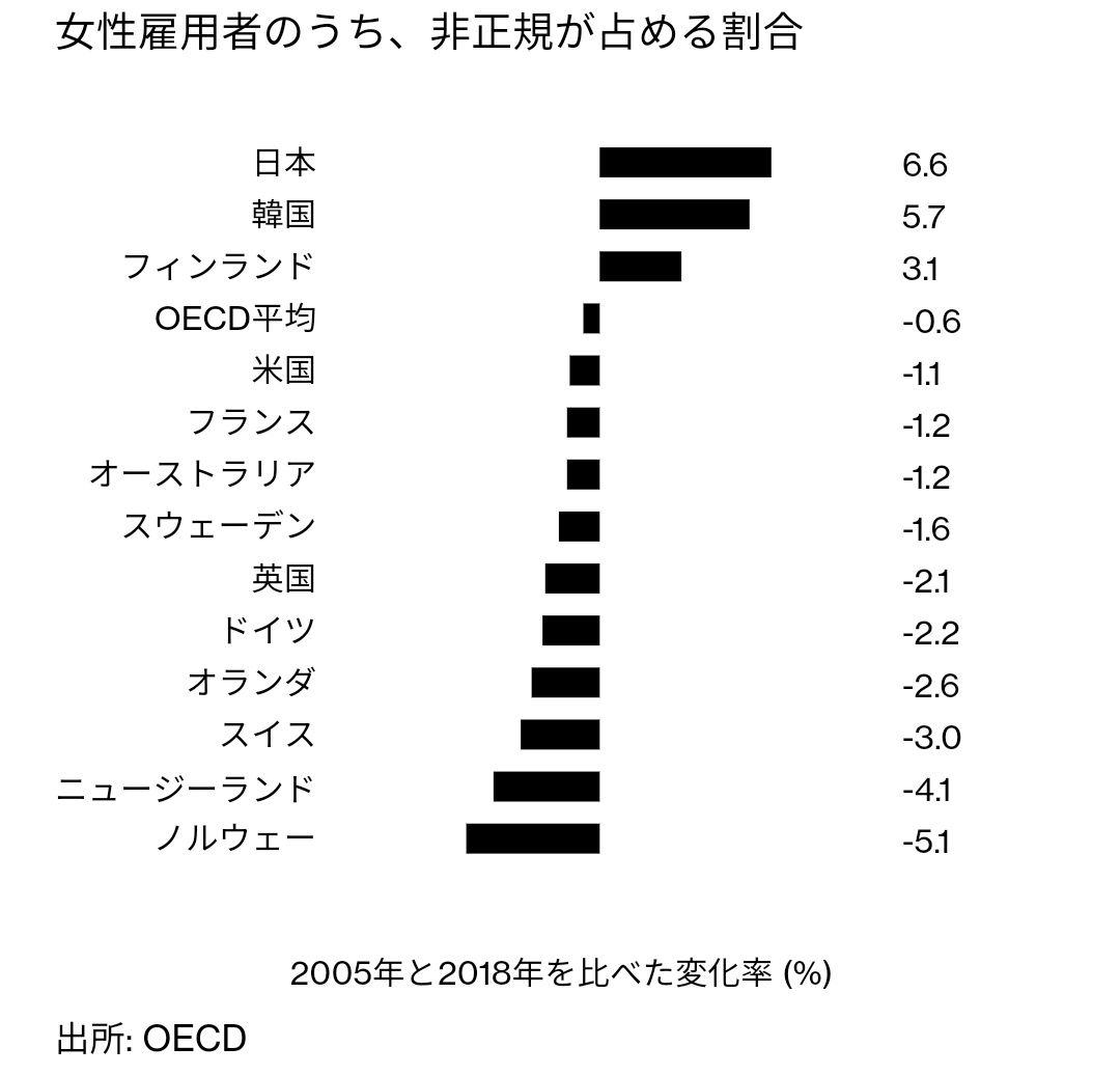 5/ "多くの女性が非正規雇用である。2012年以降,新たに350万人の女性が就業しましたが,その3分の2を非正規雇用者が占めます。国際社会で女性の非正規雇用率が低下するなか,日本では真逆の傾向がみられ,「パートだけで老後資金をためるのは難しい」のが現状となっています。”(※図表は紙面より)