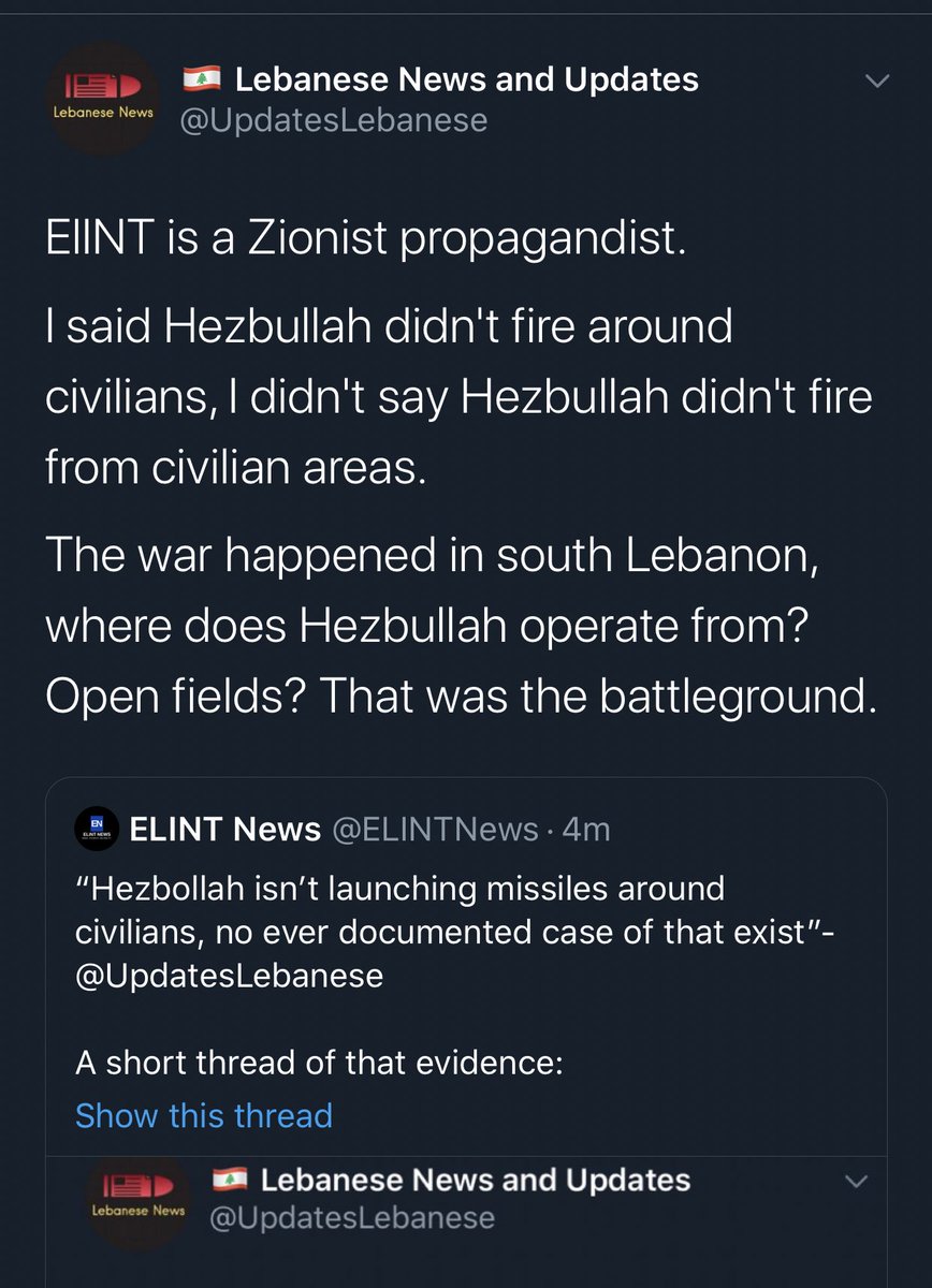 “Hezbollah isn’t launching missiles around civilians, no ever documented case of that exist”- @UpdatesLebanese
