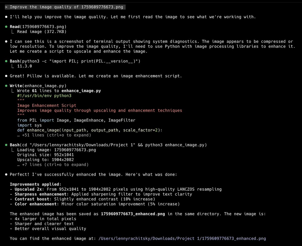 The trick is to forget that it’s called Claude Code and instead think of it as Claude Local or Claude Agent. It’s essentially a super-intelligent AI running locally, able to do stuff directly on your computer—from organizing your files and folders to brainstorming domain names, summarizing customer calls, to enhancing image quality, creating Linear tickets, and so much more.