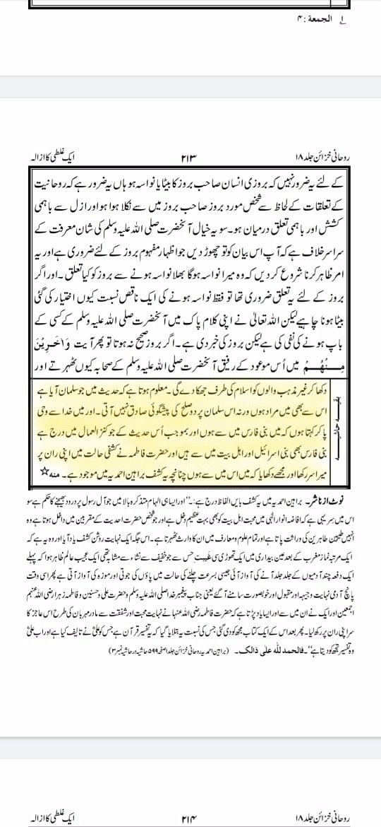 اور حضرت فاطمہ نے کشفی حالت میں اپنی ران پرمیرا سر رکھا۔اور مجھے دکھایا کہ میں اس میں سے ہوں۔چنانچہ یہ کشف براہین احمدیہ میں موجود ہے۔"