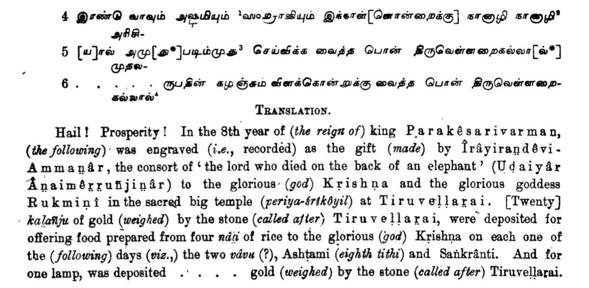 An inscription from Tiruvellarai mentions offerings to Lord Krishna and Rukmini on the day of Ashtami. This was made by Irayirandevi Ammanar, wife of Rajadithya Chola
