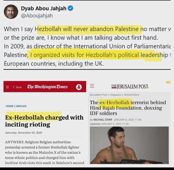 2/ HRF founder & chairman Dyab Abou Jahjah is a former Hezbollah activist & has openly praised figures connected to terrorist orgs. During the Gaza war, he actively demonstrated his support for both Hamas & Hezbollah.