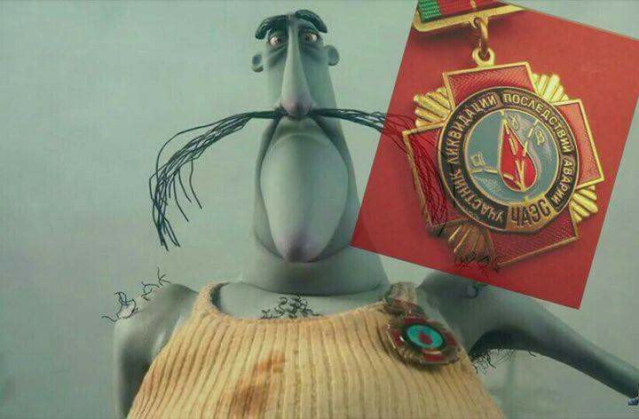 El Señor Bobinsky lleva puesta una medalla dada a los liquidadores, los hombres que fueron enviados a limpiar el desastre nuclear de Chernobyl, esto podría explicar el color azul/verdoso de su piel