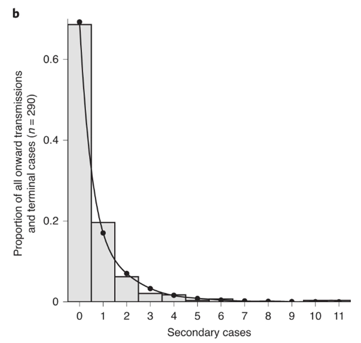 This figure from an article in nature beautifully illustrates this dichotomy between superspreading and isolated cases