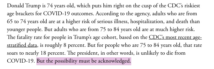 6/ The White House did not immediately point to contingency plans should Trump become too ill to continue working. Trump is 74, which puts him right on the cusp of the CDC’s riskiest age brackets for COVID-19 outcomes. theatlantic.com/health/archive…