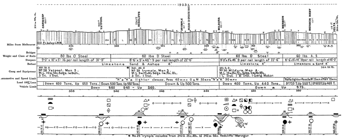 The broad gauge (5' 3") railway to Mildura opened in 1903, Merbein in 1910 and Yelta in 1925. Yelta to Dunolly converted to 1,435 mm (4 ft 8 1⁄2 in) standard gauge 2018, which connects with the standard gauge line to Maryborough. vrhistory.com/VRMaps/Vic1940…