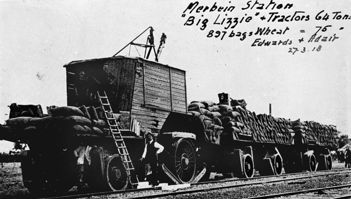 'Big Lizzie': at the time the largest tractor built in Australia with a 60 hp 8 ton, 215 rpm single cylinder Blackstone oil engine. The tractor unit: 34 ft long x 11 ft, weighing 45 tons.