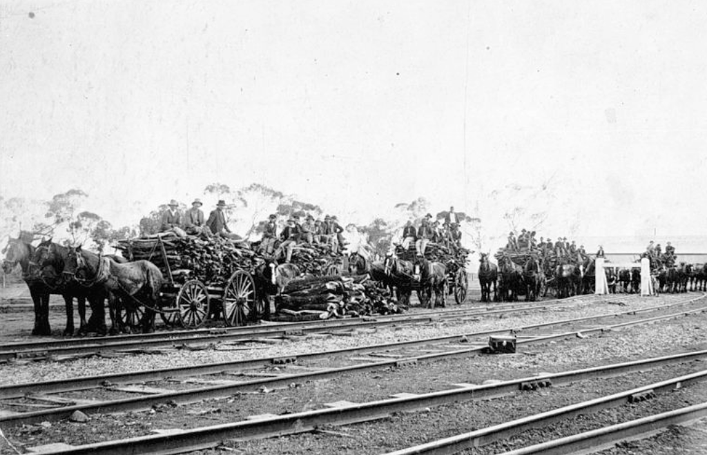 Wagon loads of wood at the Merbein Railway Station. Frederick Russell was the wood contractor. In the background, is the Mildura Co Operative Fruit Company.