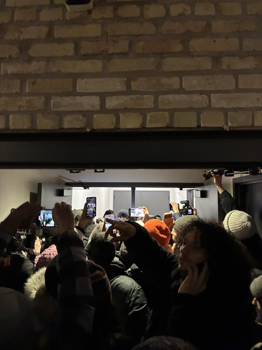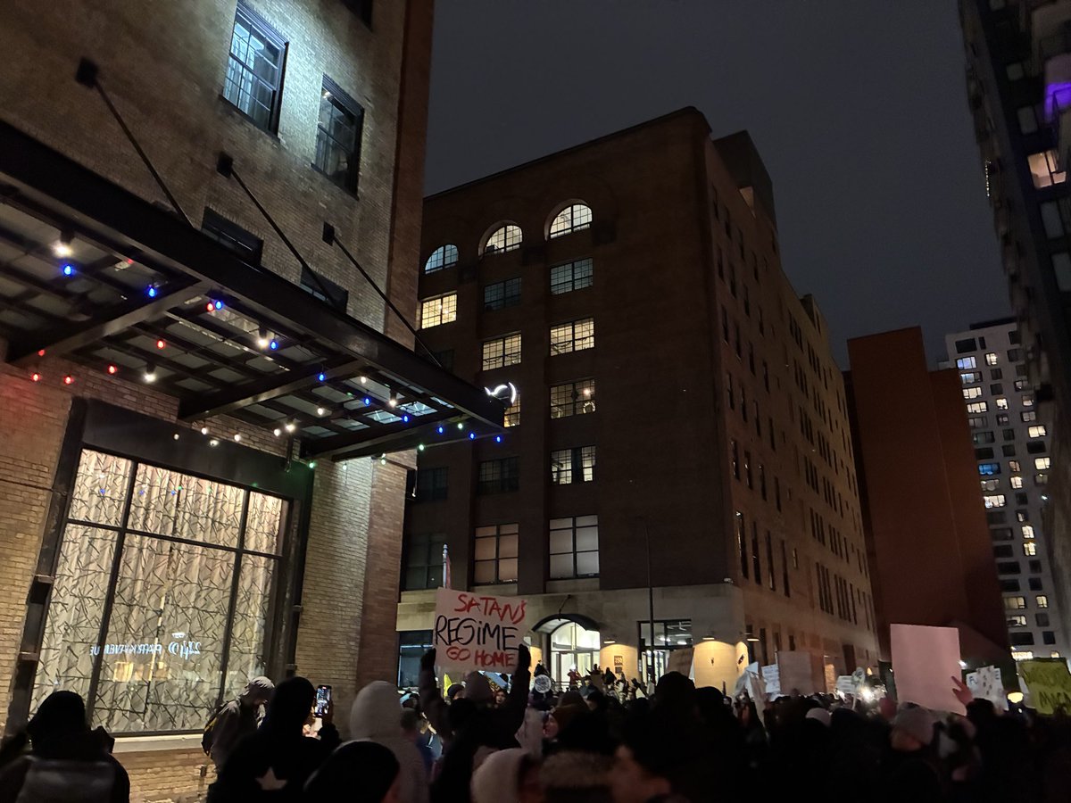 With ICE agents rumored to be staying at this downtown Minneapolis hotel, roughly 1,000 protesters are outside shining lights and making as much noise as possible — including via bullhorn, trombone, drums and sax — on a Friday night.