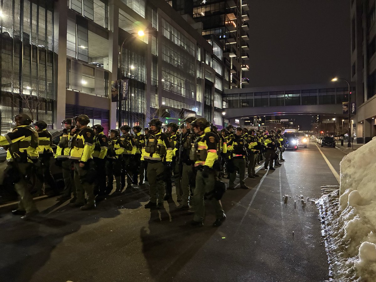 Protesters down to fewer than 100, some throwing ice/snowballs at a line of state police officers. At a standstill here on Third St in downtown Minneapolis.