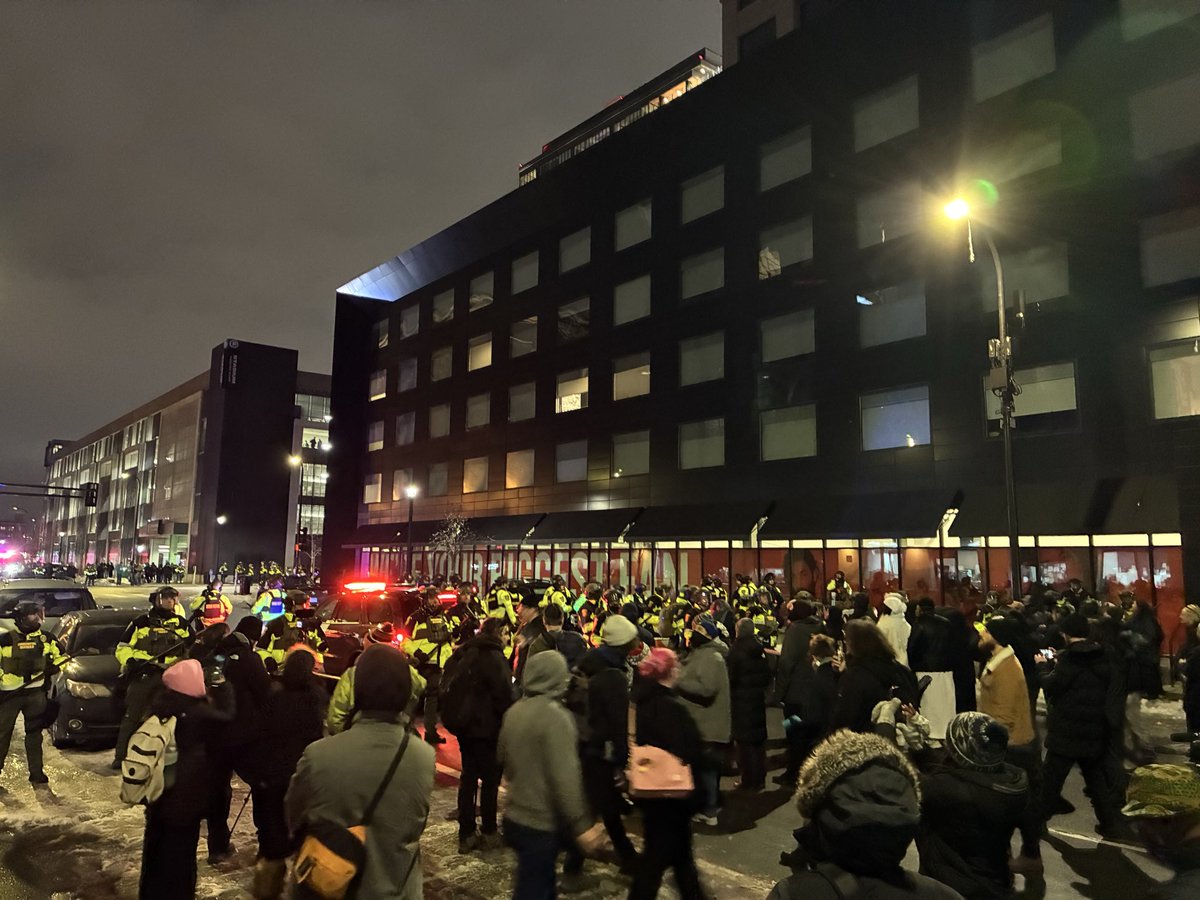 Minneapolis Police have issued an "unlawful assembly" notice, ordering people to leave the area, shortly after a dozen or so people tried to rush into a side door of the hotel.