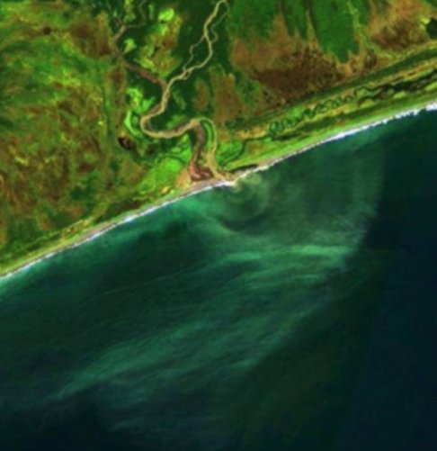 Получили от Green Peace спутниковые снимки реки, которая находится рядом с тем полигоном и впадает в океан. Она, очевидно, и принесла смерть всему живому.