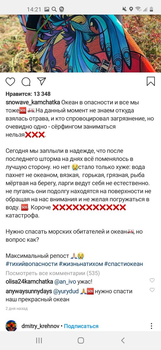 "Еще 3 недели назад все после серфинга начали испытывать странные неприятные симптомы. Помутнение, сухость, боль и ощущение пленки на глазах. Першило горло, отекали и садились связки. Вкус океана – горький, не соленый, совершенно непривычный. Спустя время у нас – человек 20-ти,