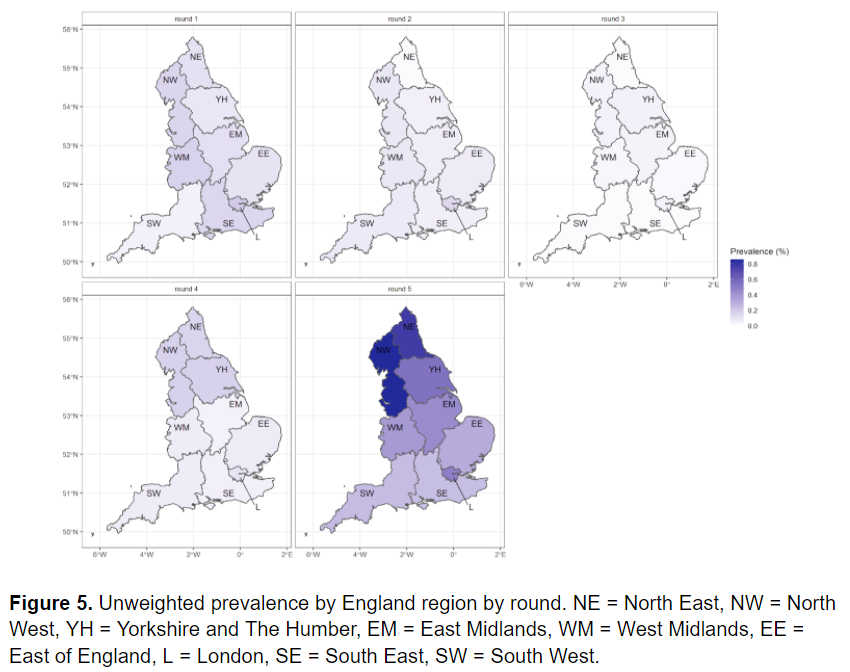 - Highest unweighted prev in r5 was in the North West at 0.86% (0.69%, 1.06%)