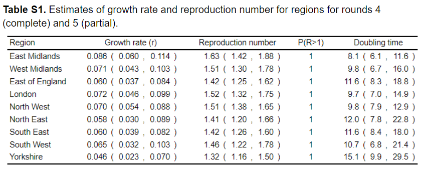 From the most recent round 4 data (22nd August and 7th September): doubling time 7.7 (5.5, 12.7) days and R=1.7 (1.4, 2.0)