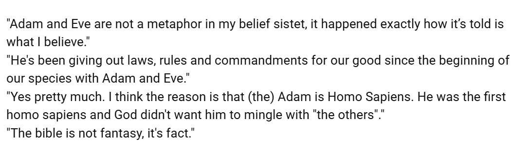 - believing in a non-metaphorical Adam and Eve
