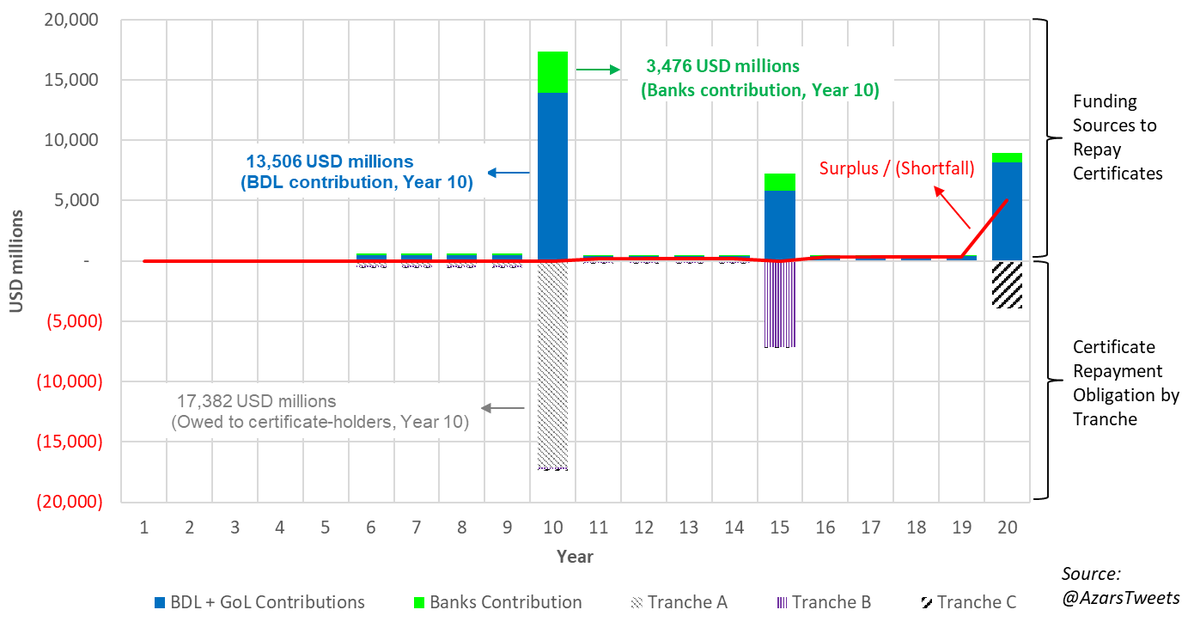 In any case, the scenario below assumes $35B of ineligible deposits is, in fact, written off. The chart shows the annual repayments for each Certificate (negative numbers) and the source of funding for such repayment (positive numbers).