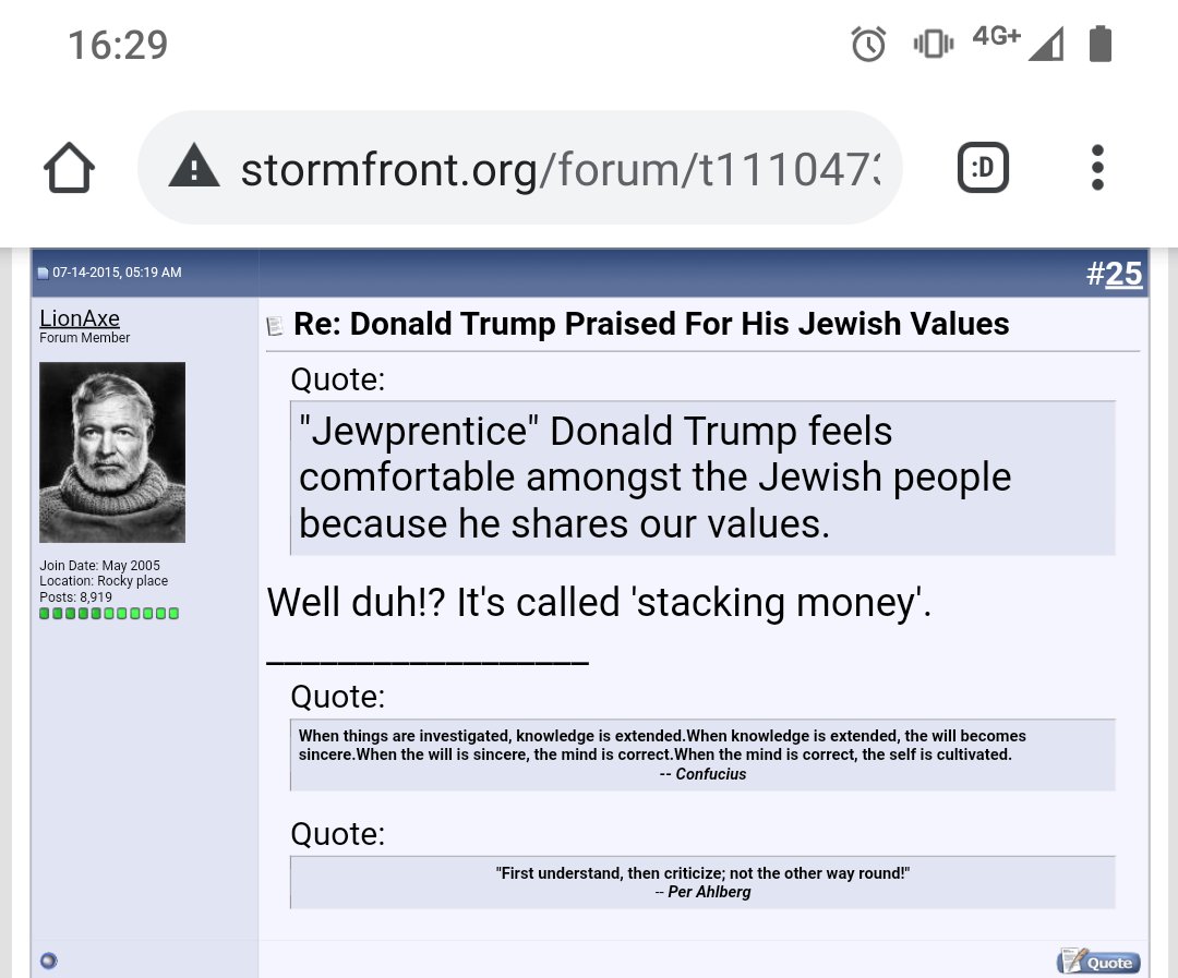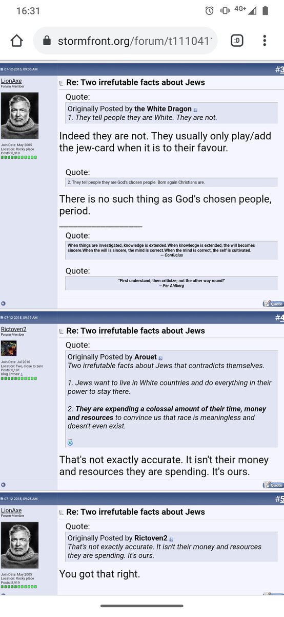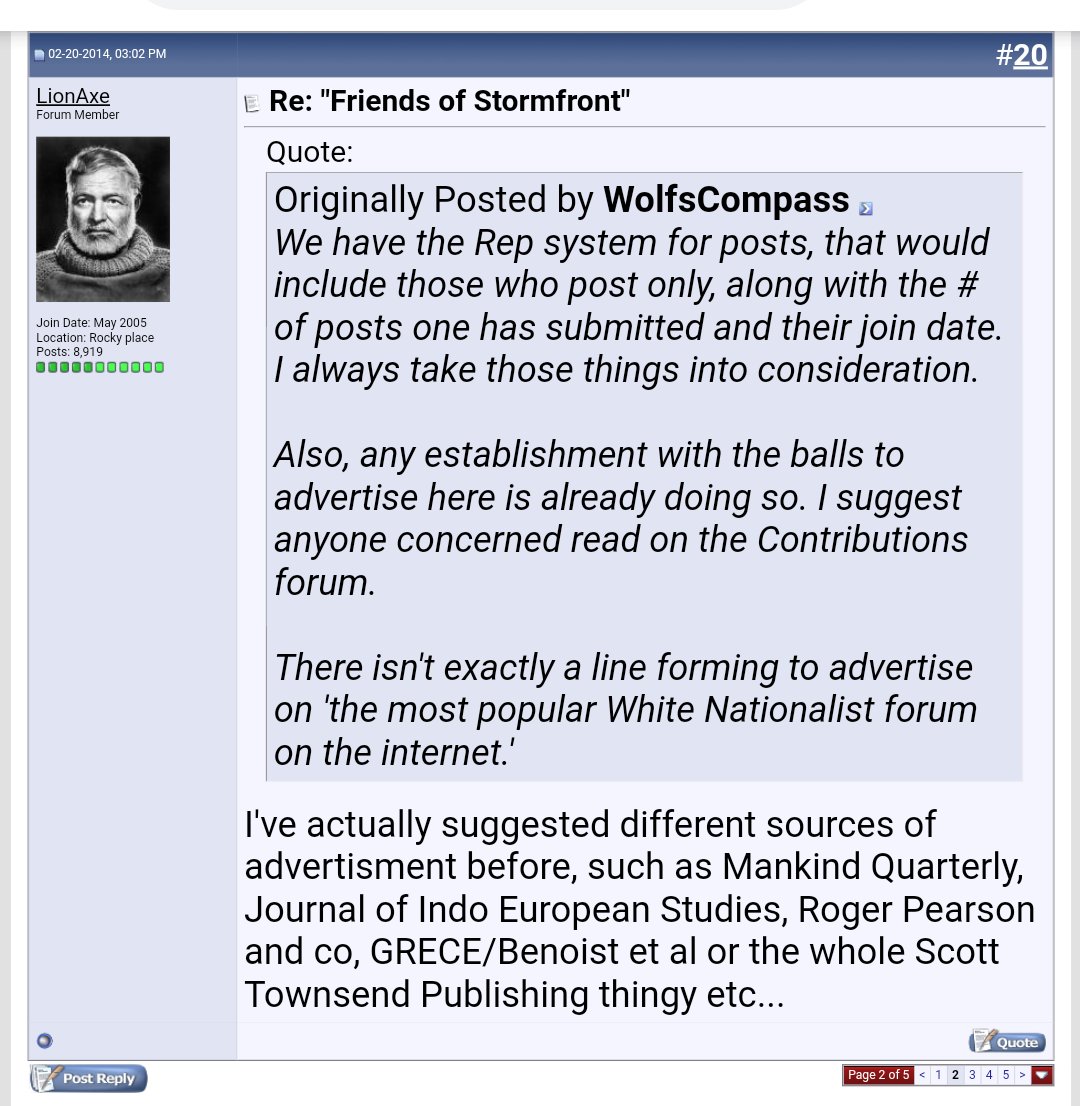 Men en annan bild framträder när man tittar på Hans 9000 inlägg på USAs största högerextrema forum, Stormfront. Där hålls en hög ideologisk nivå, med en välartikulerad position på yttre högerkanten.