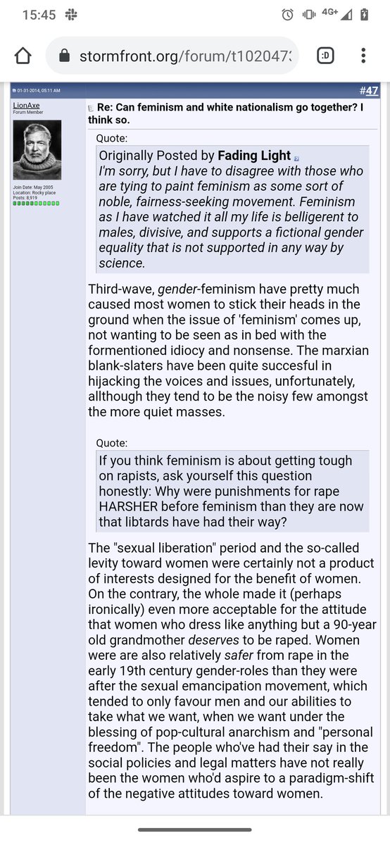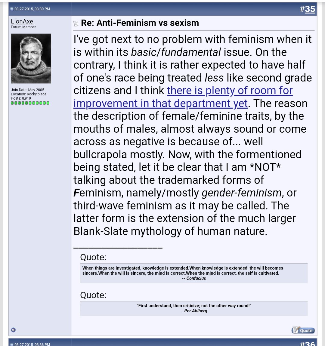 För att knyta ihop säcken. Vad har det här med Gardets radikalfeminism att göra? Jo, den biologiska essentialismen. Det är det centrala för Hans. Den feminismen försvar han på Stormfront. Men rasar över tredje vågens antiessentialistiska feminism.