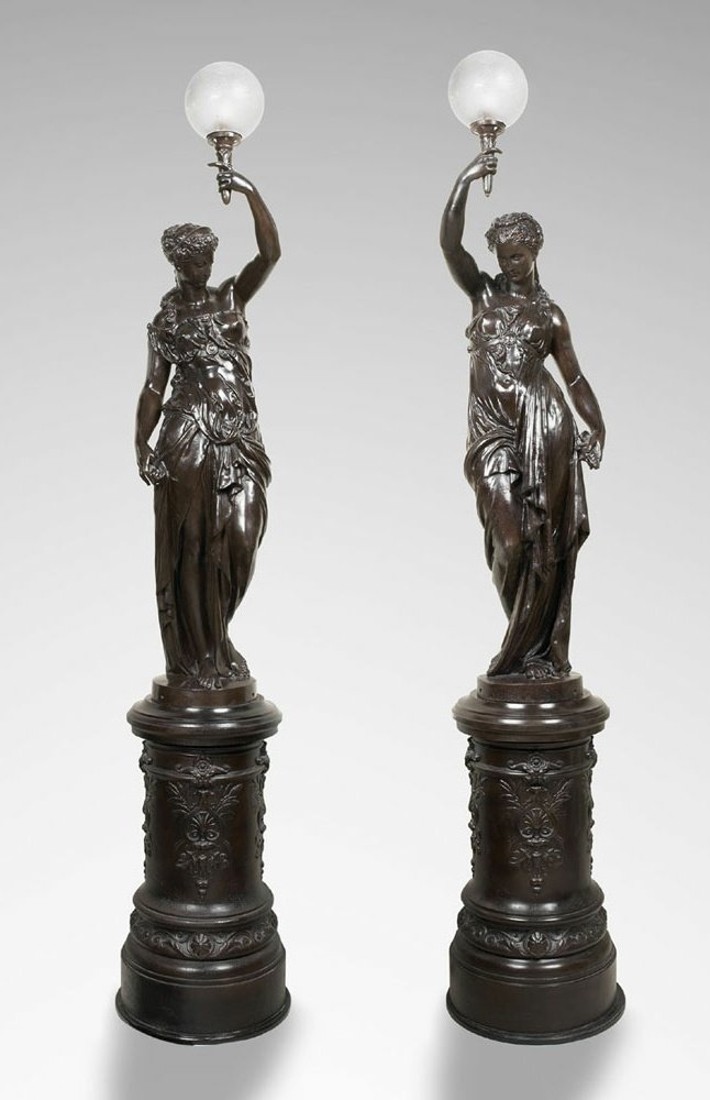 Sobre el pedestal de arenisca se colocó un porta-antorchas de fundición que representa a una egipcia con vestido drapeado. Lo identificamos en su momento como una pieza de la casa L. Thirlot Fontes d'Art Paris datada hacia el año 1900.