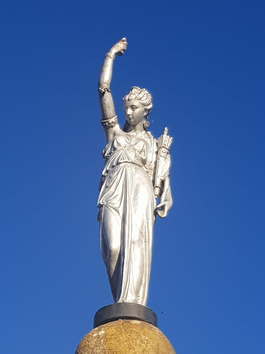 La pieza ha sufrido arreglos, modificaciones y ha perdido la antorcha pero tras una ardua búsqueda, la hemos encontramos. Se trata de una reprodución de la Diana del importante escultor francés Auguste Joseph PEIFFER (1832-1886).