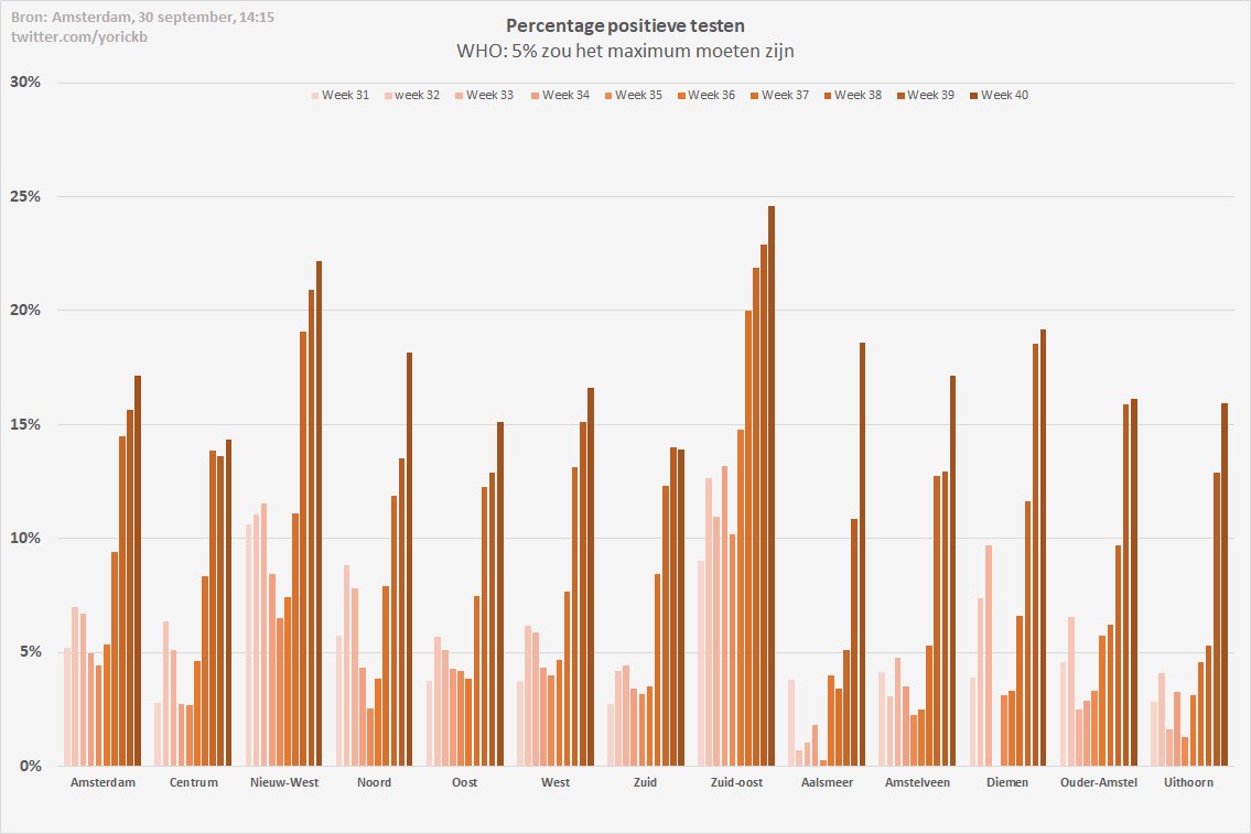 Het positieve aantal geteste personen per 10.000 inwoners. In rood: afgelopen week (week 40). In blauw: de week ervoor (week 39). Regio Amsterdam Amstellanden
