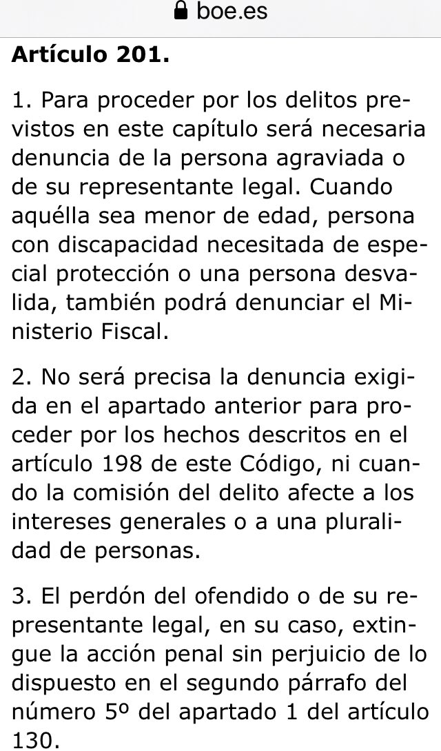 Art 201: el delito del art 197 requiere denuncia de la perjudicada contra Iglesias. No existe, y la Fiscalía ha pedido que constara si Dina le exculpaba.