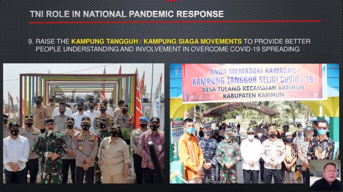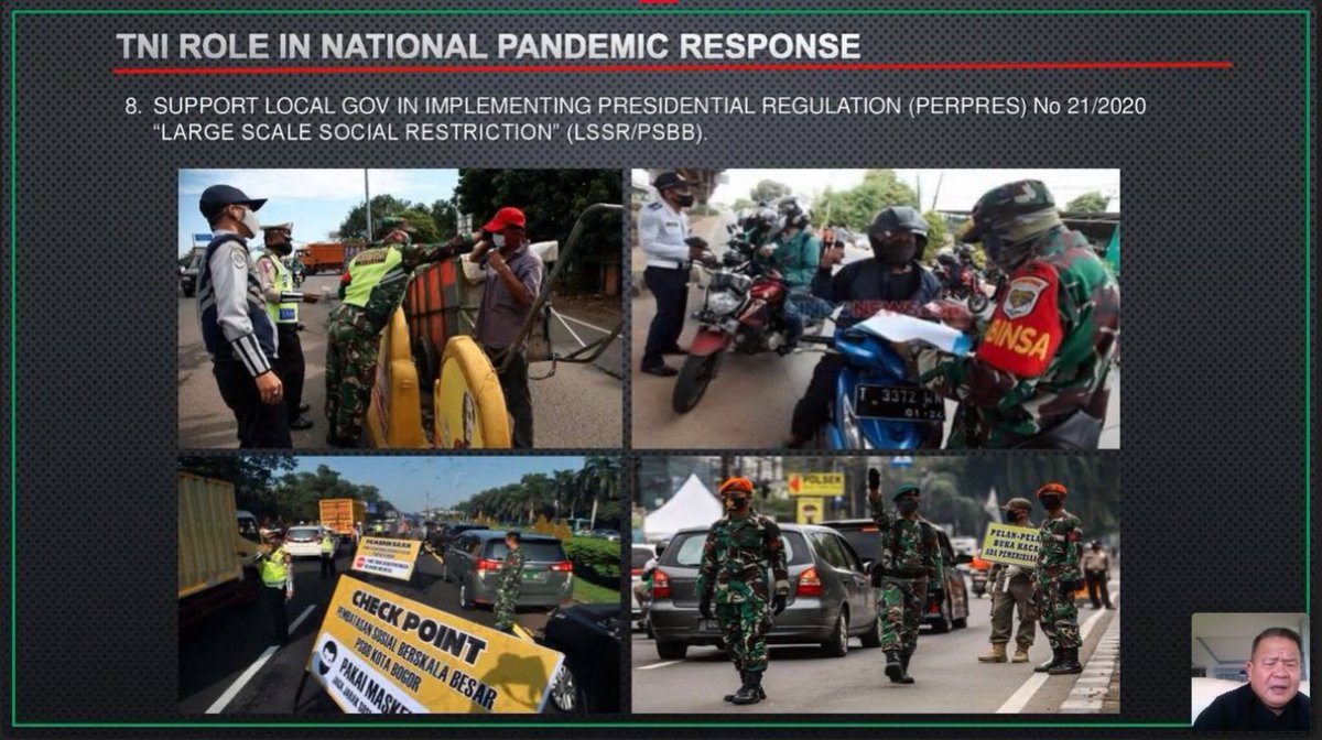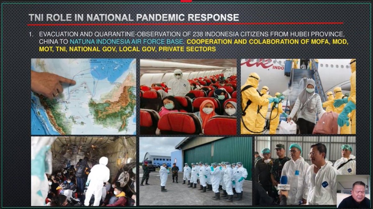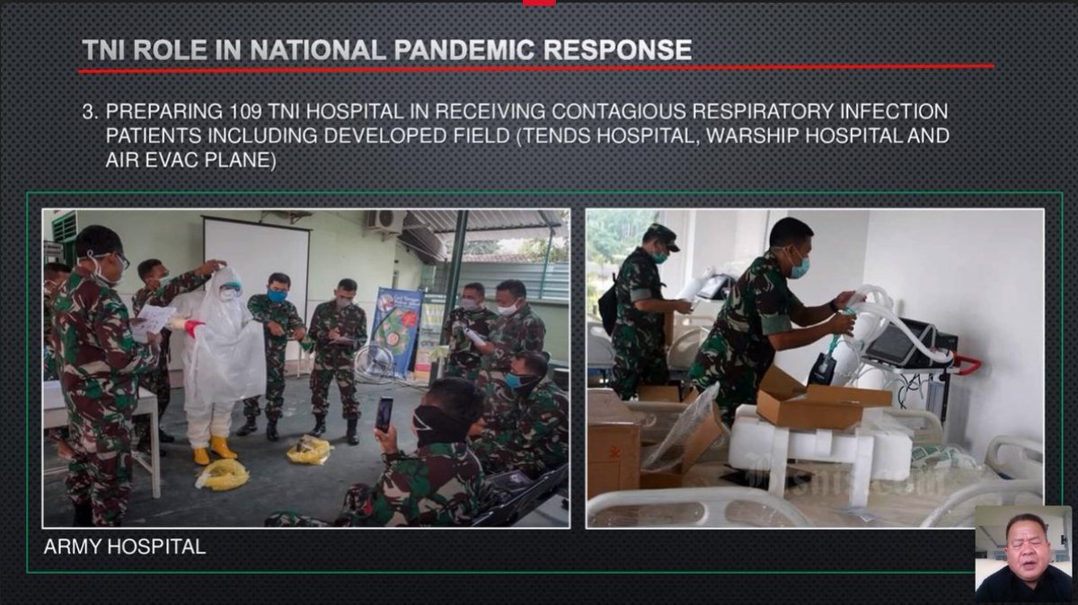 Di Indonesia,militer sepenuhnya di bawah tatanan masy madani. Tidak terlibat di kehidupan politik, jadi gimana Indonesia bisa terlibat di keg terkait COVID19? Ada instruksi presiden.