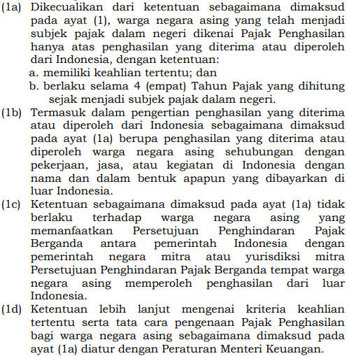 isinya menegaskan "warga negara asing yang telah menjadi subjek pajak dalam negeri dikenai Pajak Penghasilan hanya atas penghasilan yang diterima atau diperoleh dari Indonesia"