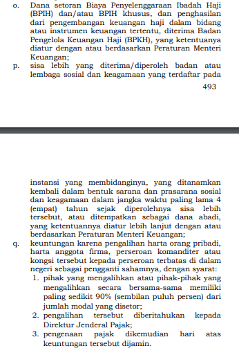 Jika di UU 36/2008, pengecualian dari objek pajak hanya sampai huruf n. Maka di UU Cipta Kerja ditambahkan 3 yang baru: huruf o, p, dan q