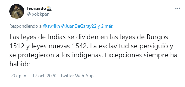 6.- El último punto que siempre están recordando son las "bondadosas" leyes de indias que emitió la corona para detener la esclavitud y el exterminio. Hay que recordar, por un lado, que justamente que fueron emitidas para parar las rapaces intenciones de encomenderos.