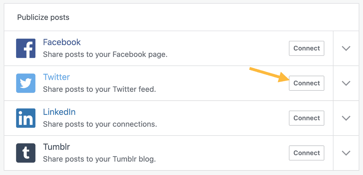 - If you don’t already have your Twitter account connected to your website, click “Connect an account” to allow WordPress to publish content on your Twitter feed. You can add multiple Twitter handles if you’ll be Tweeting from more than one account.