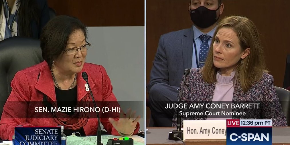 Hirono has to ask Barrett for the word "severability" which was unfamiliar to her, a person who writes federal laws for a living.