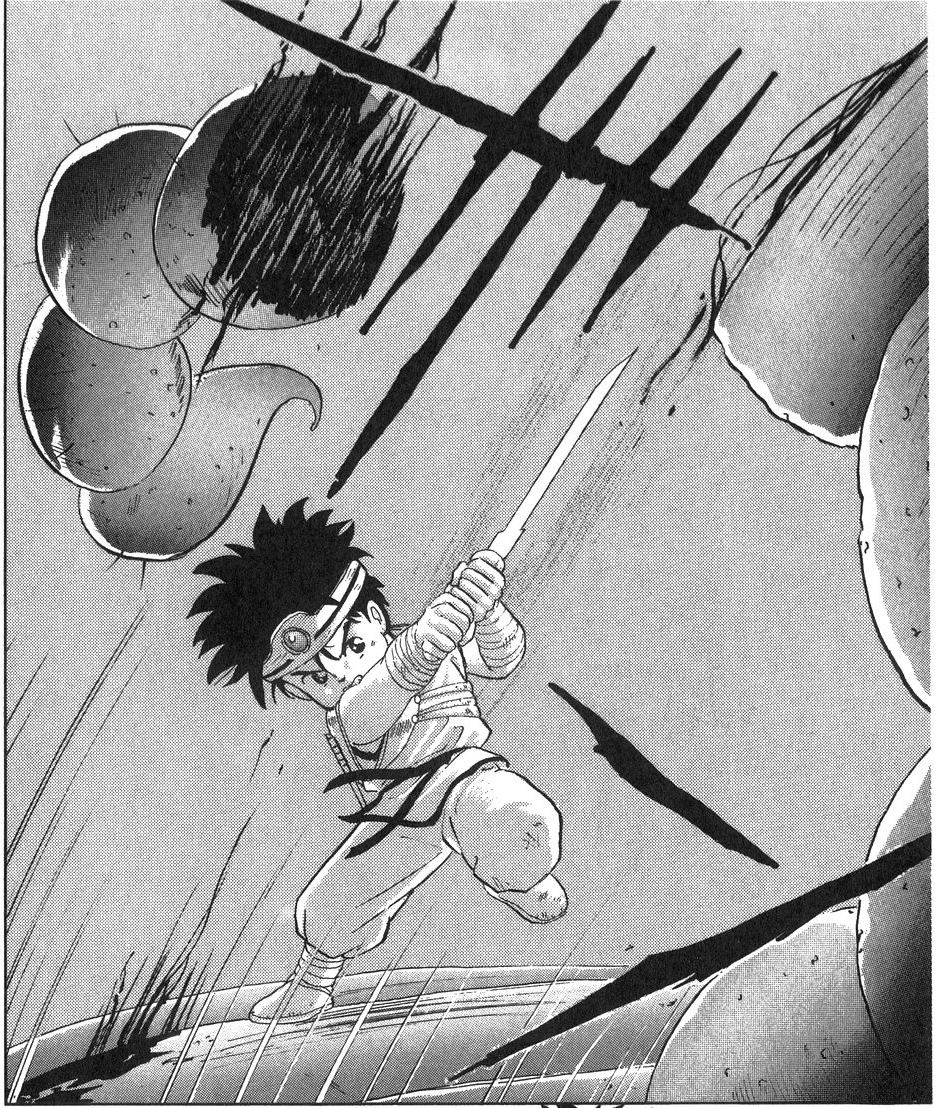 Tras asestarle Dai el golpe mortal a la criatura, en el manga el escorpión aún lanza su último coletazo, y nuestro pequeño héroe termina cortándole la cola. En el anime esta escena se omite y Dai no le corta la cola al escorpión. Image