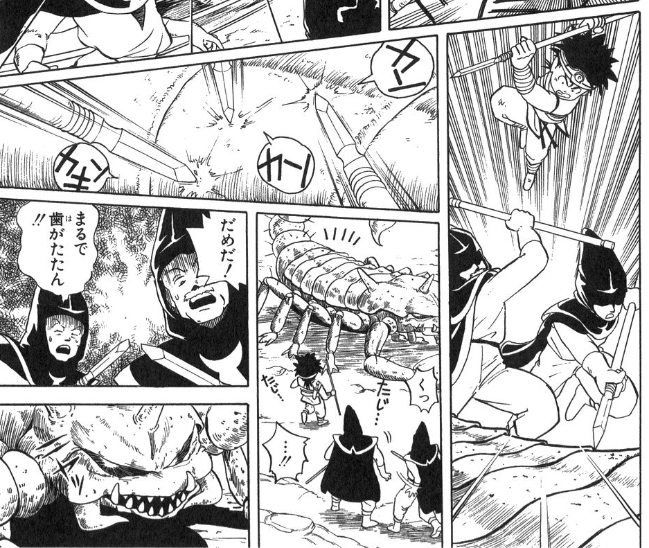 En el manga solo vemos a unos monstruos atacando una aldea, esa escena de Pop y Avan no existe. Los ataques de los monstruos a los aldeanos son más salvajes y sangrientos que en el anime y no se ven muchos soldados que digamos. En el manga tenemos una escena más desesperanzadora. Image
