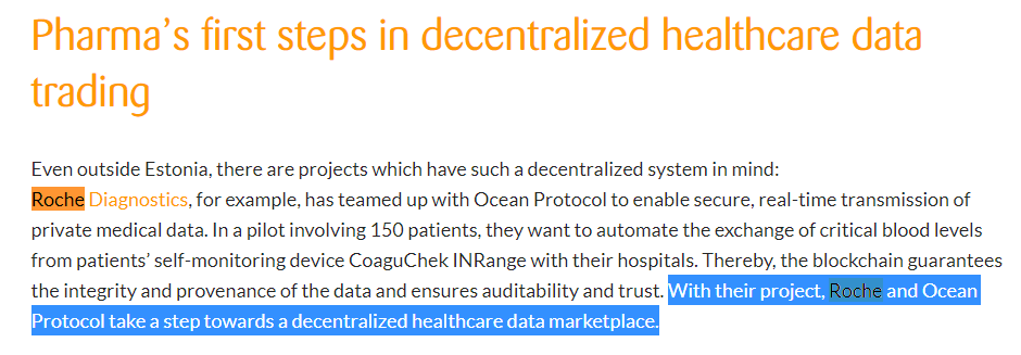 The Roche + $OCEAN partnership was originally announced back in Jun 2019, where they worked together to improve care for heart disease patients through safe and secure data sharing.