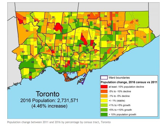 Charts tell the story, census data from 2011 to 2016. Source on left is CBC, for right city of Toronto. More than 10% growth in T.O. core. City projects trend will continue