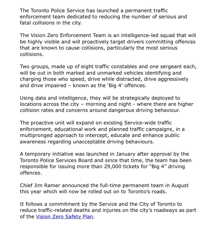 Sorry for radio silence - my phone didn’t like the rain. Here is the news release - reconstituted Toronto police traffic enforcement squad launching on a permanent basis Nov. 19 with 18 officers incl. 2 sergeants as part of #VisionZero