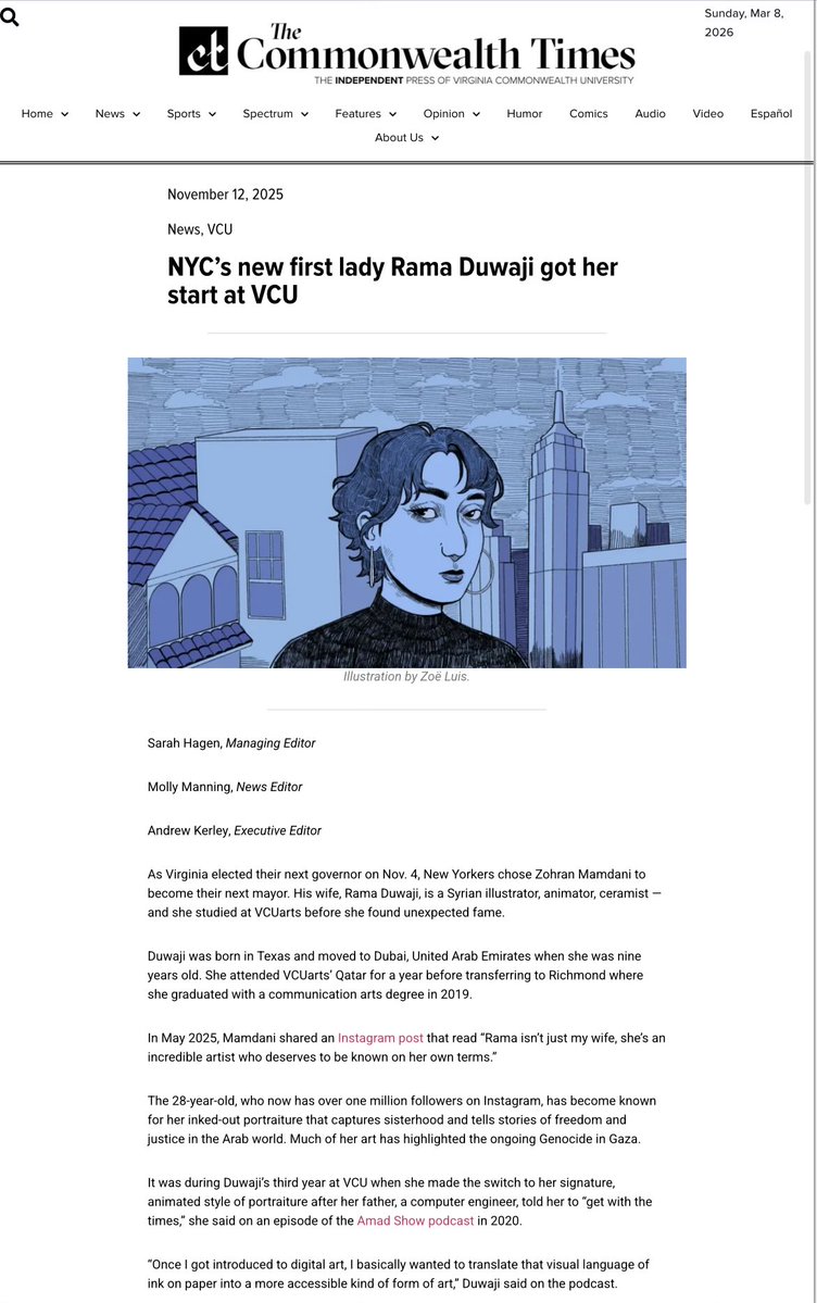 Rama Duwaji was born in Texas (Houston) and moved to Dubai, United Arab Emirates when she was nine years old. She attended VCUarts’ Qatar for a year before transferring to Richmond where she graduated with a communication arts degree in 2019.