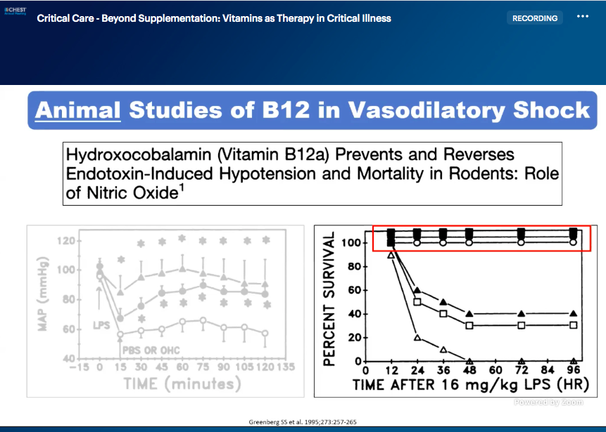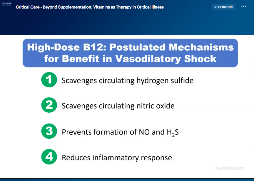 First up: Dr. Jayshil Patel: High-Dose Vitamin B12: An Emerging Therapy for Septic Shock? Leading us through some pathophysiology underlying why High-Dose Vitamin B12 might be helpful. #CHEST2020