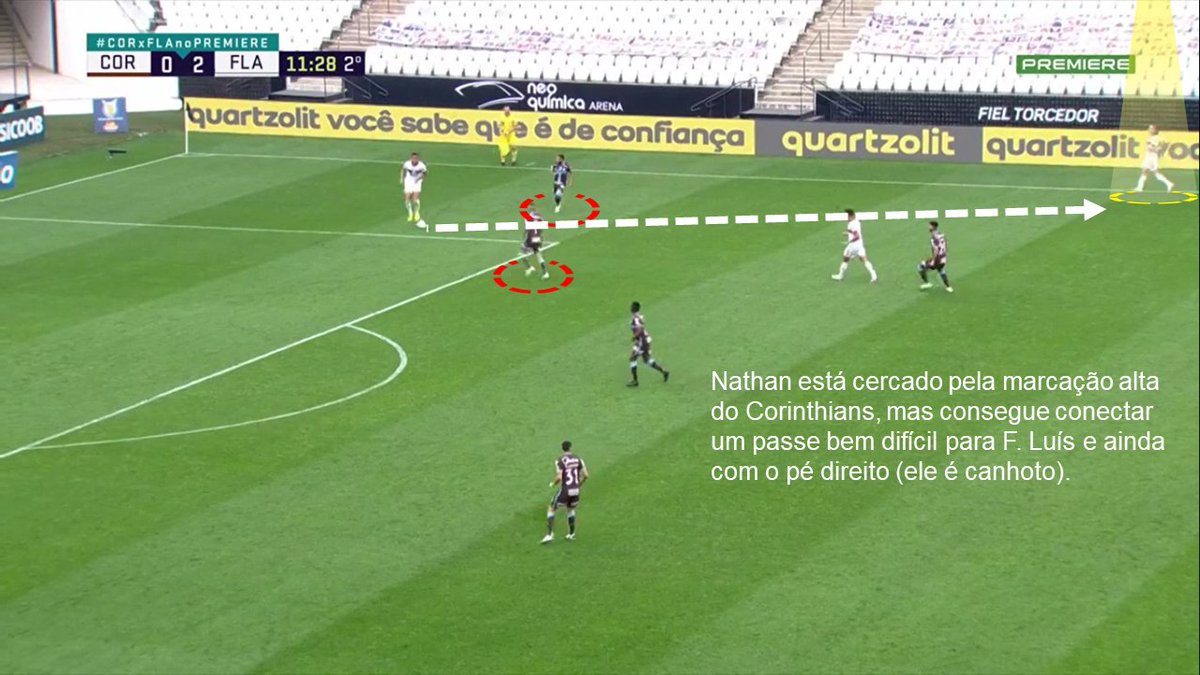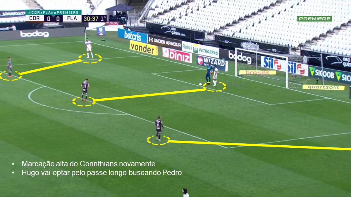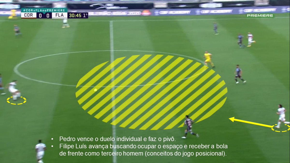 E o lance do primeiro gol surge justamente num desses lançamentos, provando que não se trata de chutões aleatórios. O Corinthians sobe a pressão no tiro de meta do Fla, Hugo conecta Pedro no passe longo, ele faz o pivô e entrega para F. Luís vindo de trás como terceiro homem.