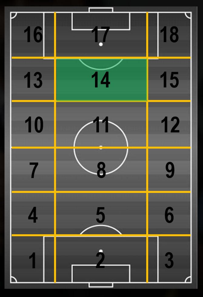 Pra quem não sabe o que é a zona 14, imagine o campo de futebol subdividido em 18 zonas a partir de 2 linhas verticais e 6 horizontais. A zona 14 é o quadrante localizado na entrada da área ofensiva e é famosa porque é nela onde a maioria das ações ofensivas de perigo são criadas
