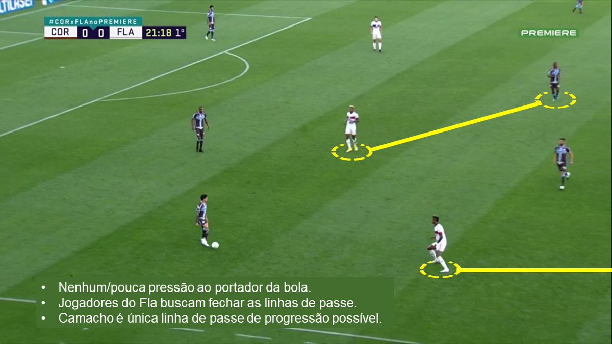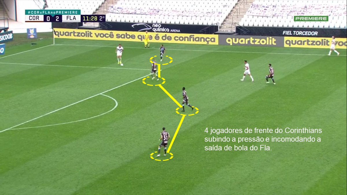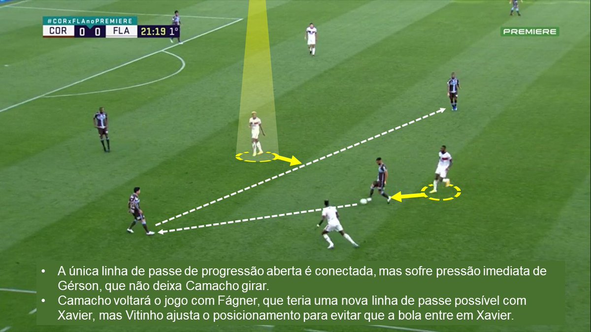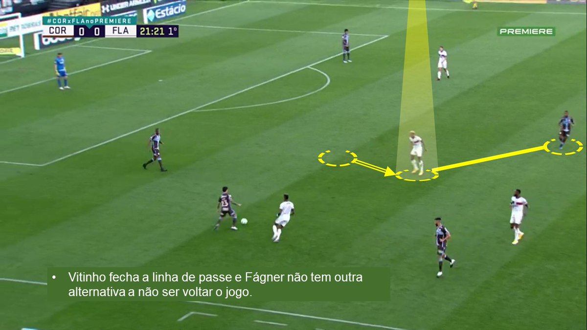 Repare que esses desarmes aconteceram mais pelos lados do campo. Não é coincidência. O Fla fechava bem as linhas de passe pelo centro e obrigava o Corinthians a tentar sair por fora ou dar chutão. Quando tentavam sair pelo lado, o Fla conseguia encontrar o momento de dar o bote.