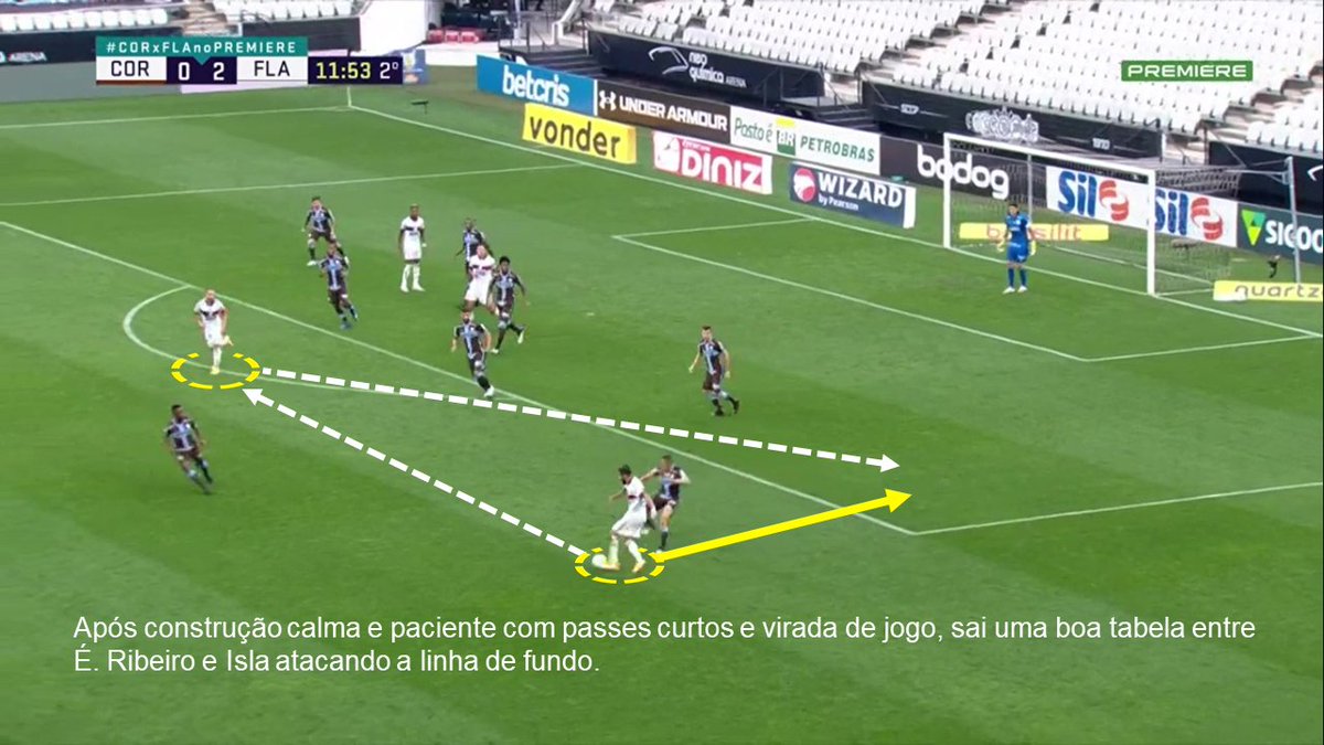 A jogada se desenrola toda pelo lado esquerdo e vale o destaque na fase terminal da jogada a movimentação de Pedro atraindo dois defensores do Corinthians e deixando espaço na segunda trave para É. Ribeiro e Vitinho entrarem praticamente livres.